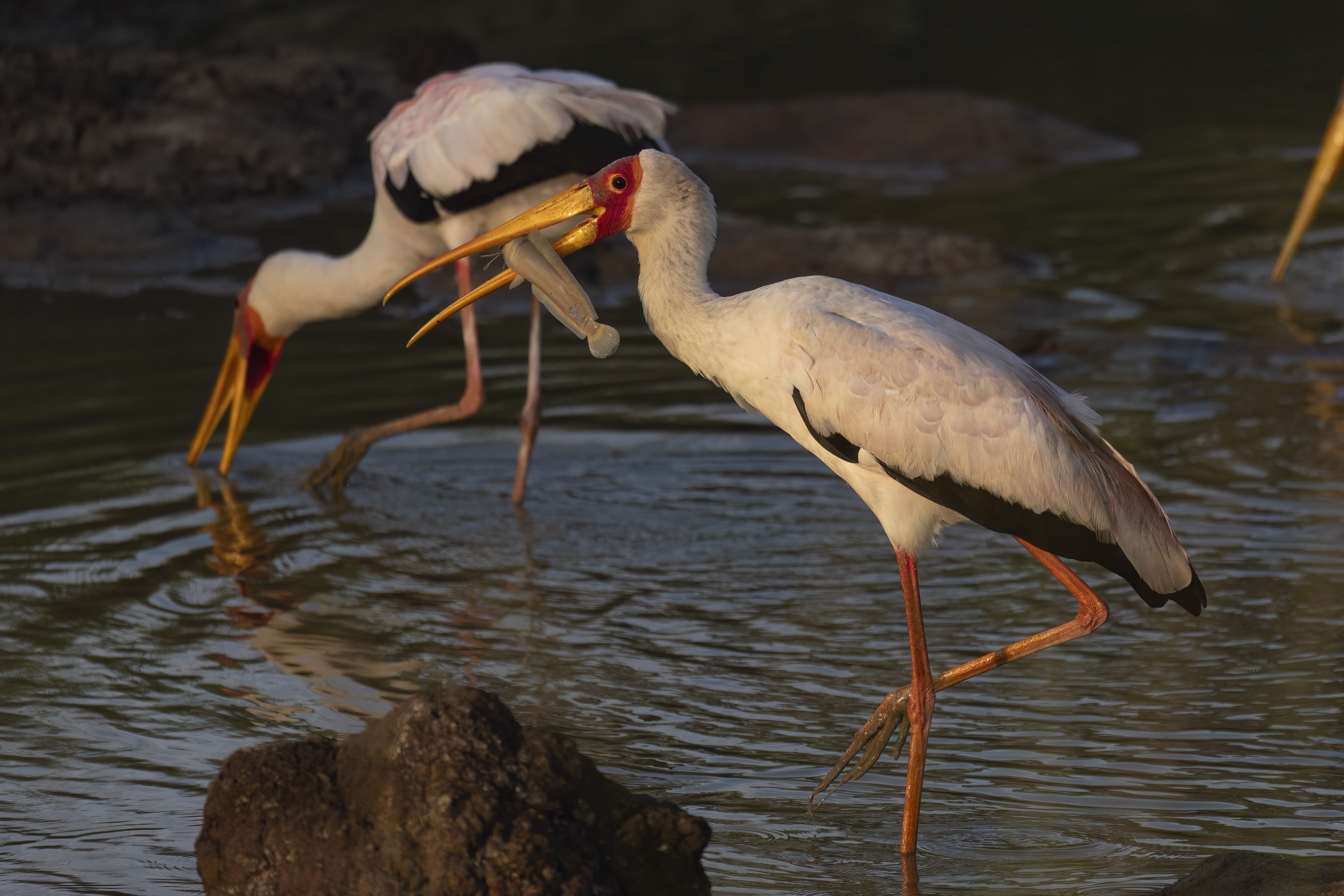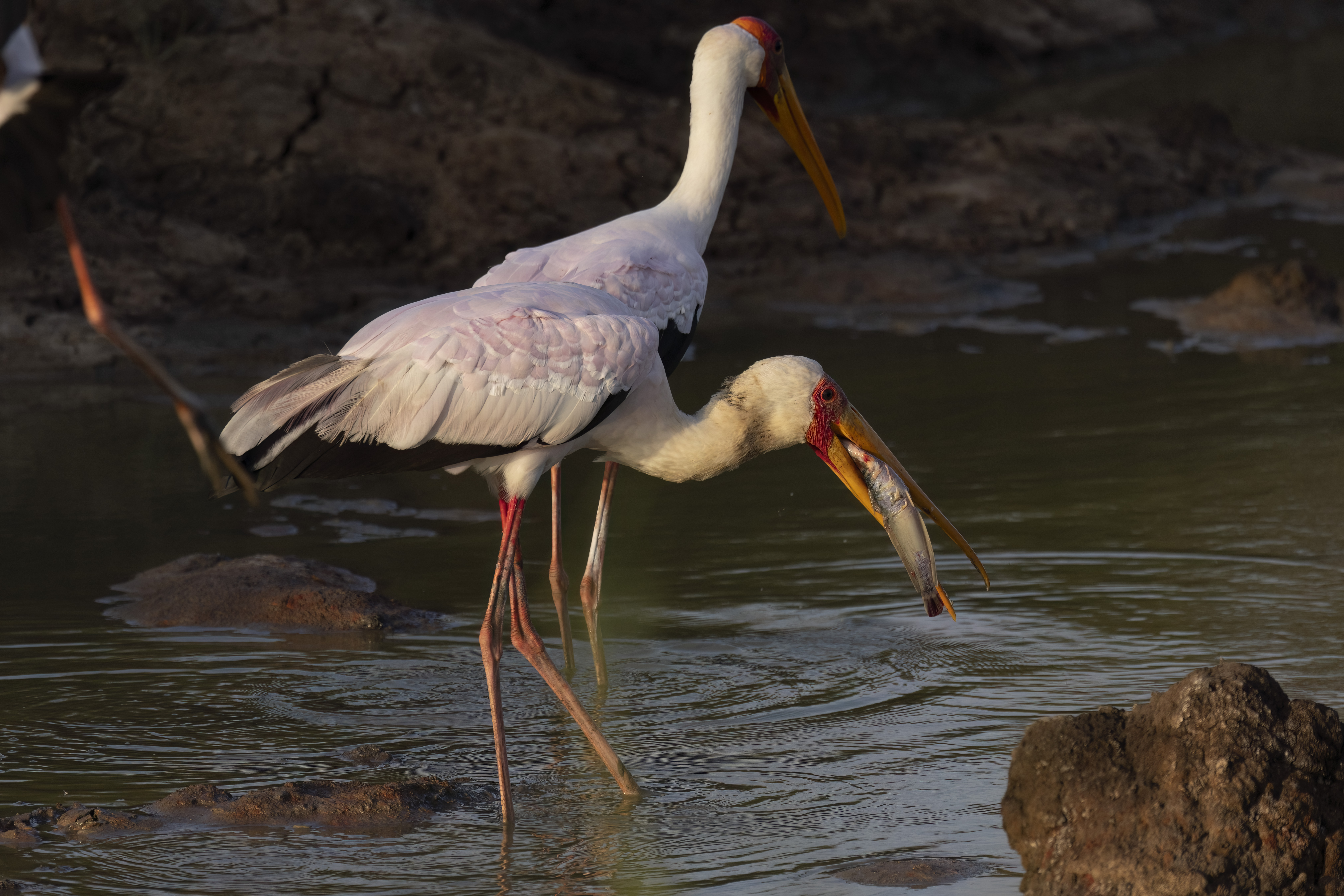 Желтоклювые аисты и люди ловят в лужах на обочине сомиков.